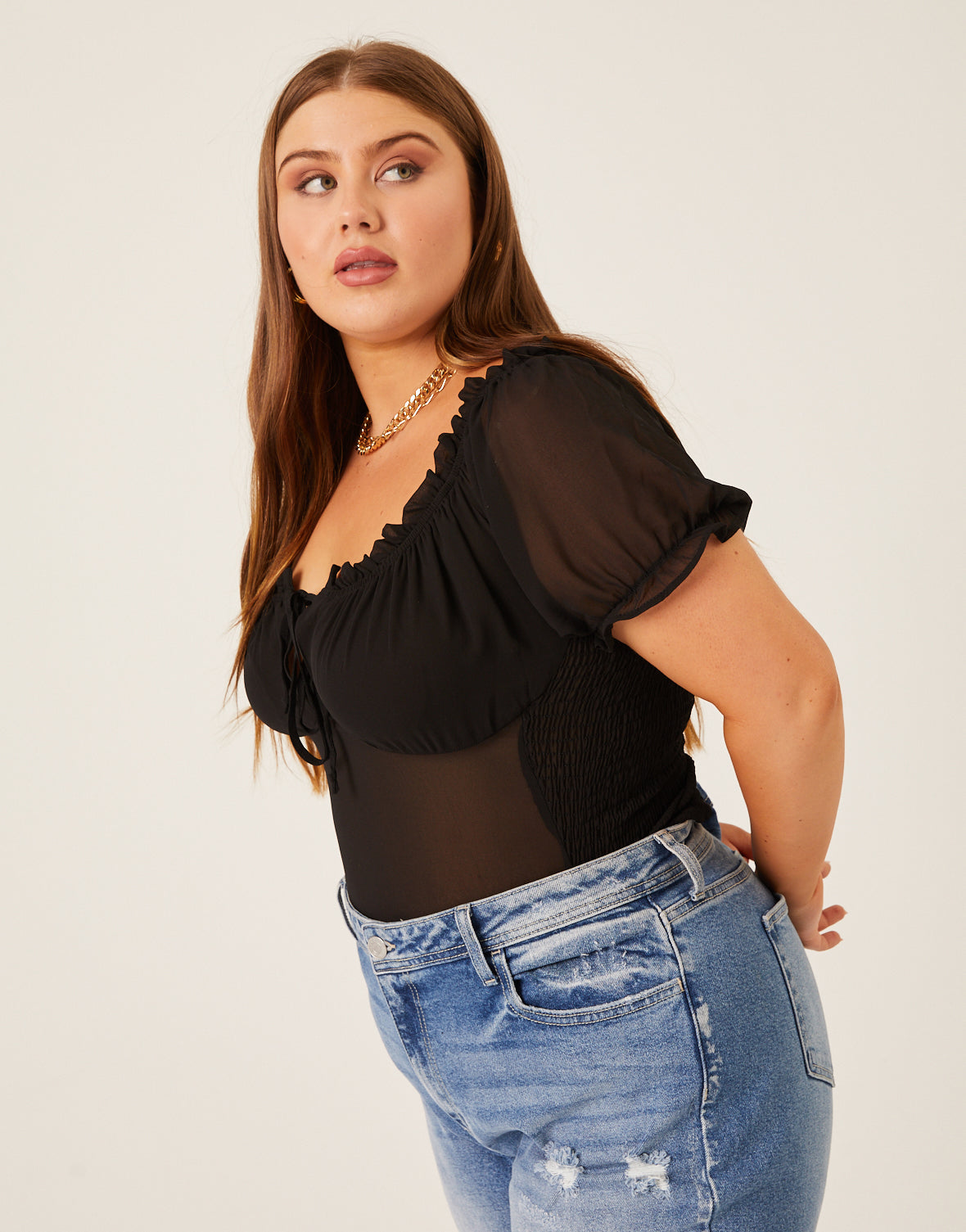 Feminine puff sleeves round out the simple yet elevated?Curve Chiffon Smocked Back Blouse. This feminine, plus size top is casual enough to wear to school or out with friends, but easy enough to dress up and wear to work. It's simply the difference between pairing it with a pair of or with some statement .