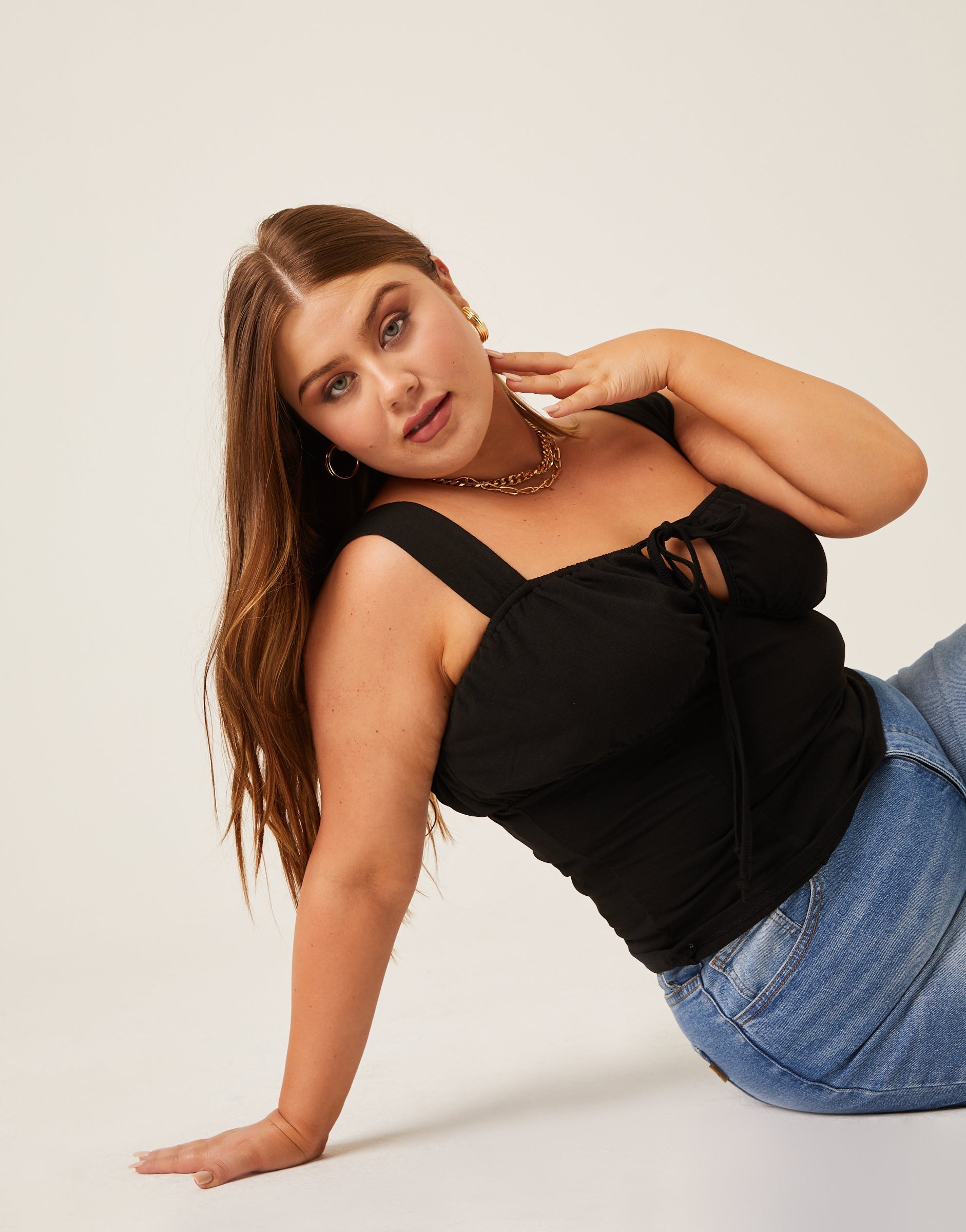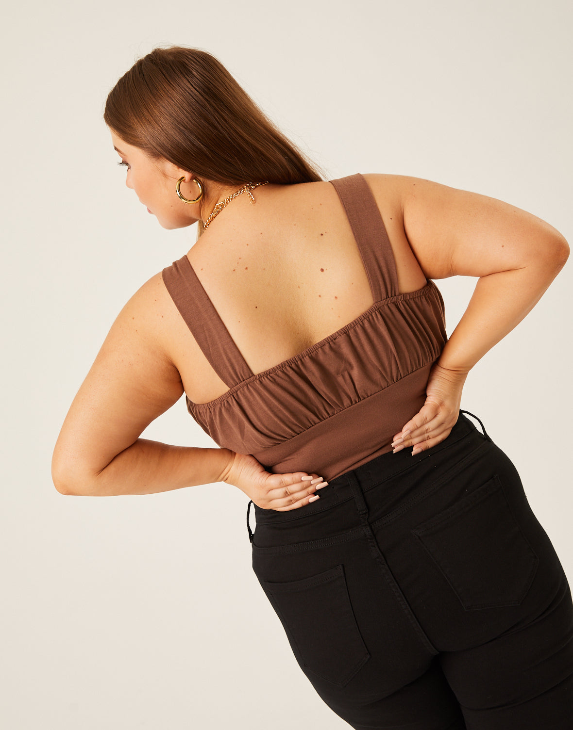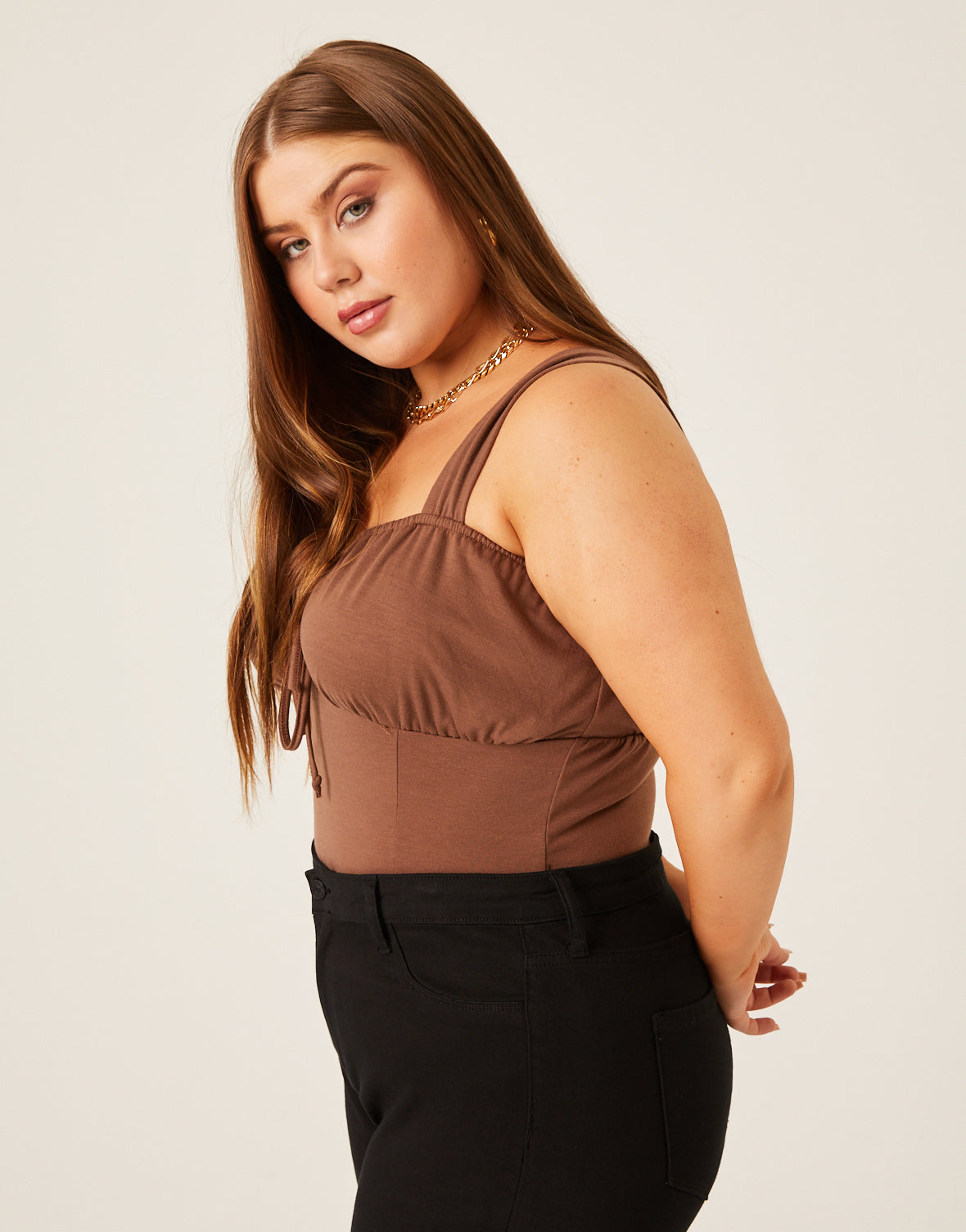 An easy, sultry top, the?Curve Ruched Bust Tank is a great basic to have on hand. This plus size tank top is detailed enough to be worn on its own but we love throwing a ?over everything, and the pretty bust detail gives a great excuse to show off a new?!?