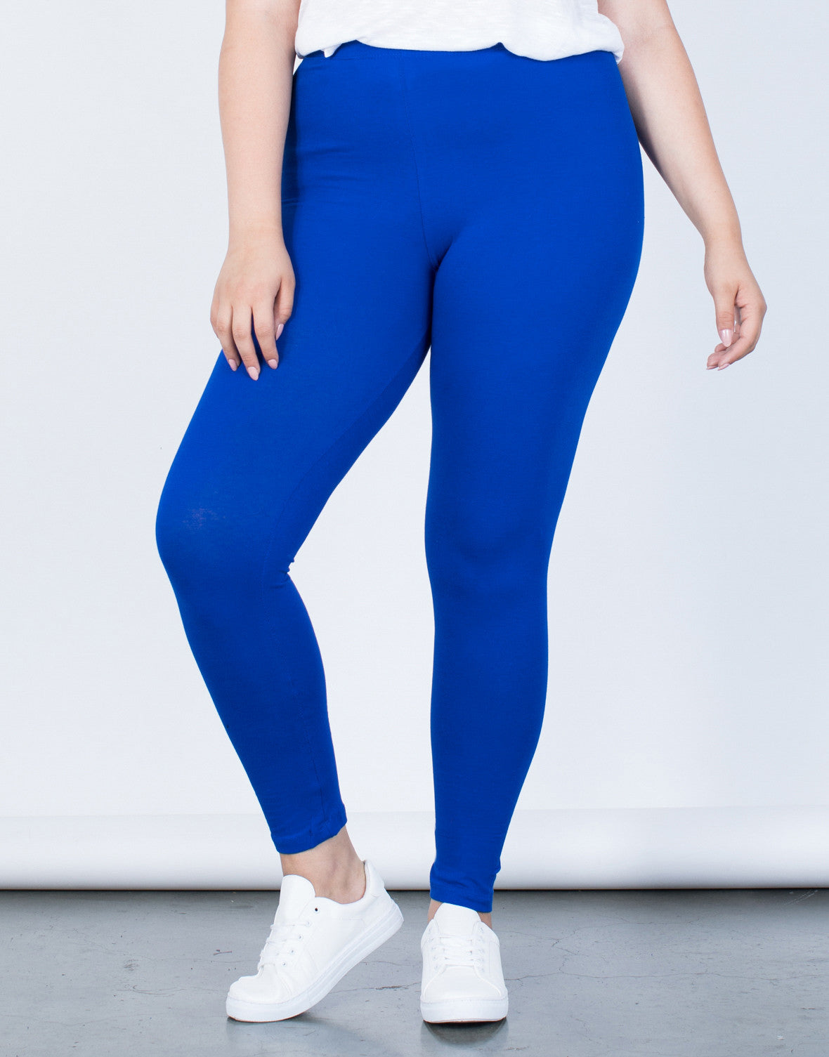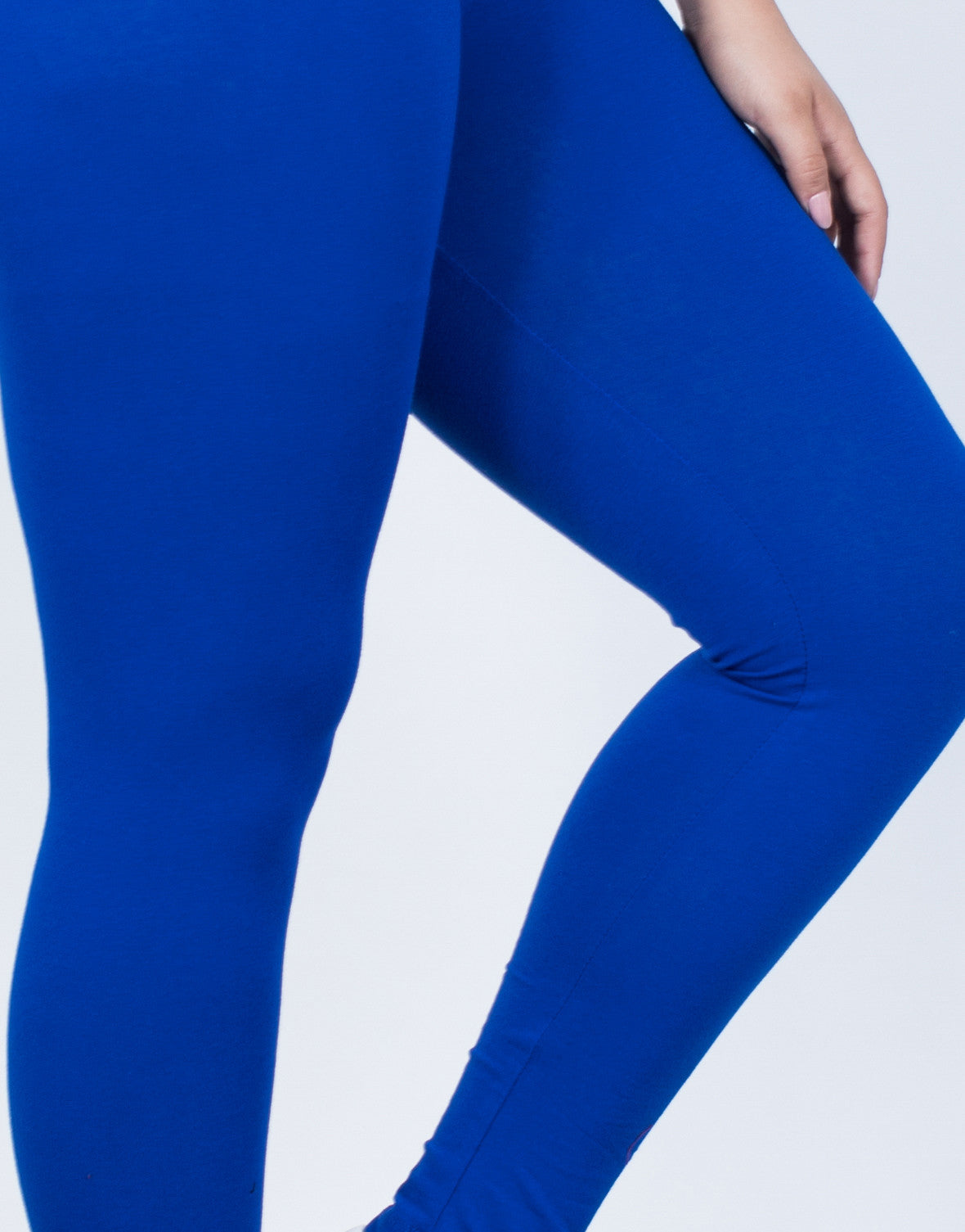 Head out on a busy day in our Curve On the Go Leggings with its' classic style and slim fit! This pair of women's plus size leggings have a stretchy elastic band for added comfort. Made from a smooth knit fabric providing you with the perfect amount of stretch. Love your weekends so much more in our royal blue and black colors. Pair these active leggings with a basic t-shirt and metallic sneakers to go run some errands in the city! These leggings are made from 95% Cotton and 5% Spandex. Recommended to hand wash cold. Imported.